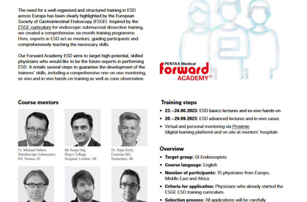 Eksperci programu Pentax Forward Academy: Amyn Haji — Dyrektor Medyczny, Szef Chirurgii Kolorektalnej i endoskopii zabiegowej Szpitala King’s w Londynie; Arjun Koch — kierownik zakładu endoskopiii szpitala Erasmus w Rotterdamie, jeden z głównych ekspertów ESD w przełyku w Europie; Michael Haefner — wszechstronny endoskopista, kierownik endoskopii szpitala uniwersyteckiego w Bolzano, a obecnie wdrażający procedurę dyssekcji w jednym ze szwajcarski kantonów; Jeremie Jacques i Mathieu Pioche — profesorowie medycyny z Limoges i Lyonu, osoby z największym doświadczeniem w ESD we Francji.