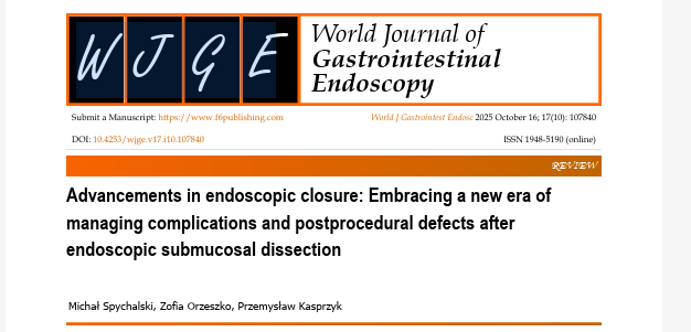W najnowszym wydaniu World Journal of Gastrointestinal Endoscopy ukazał się mój artykuł dotyczący różnych sposobów zamykania ubytków po zabiegach endoskopowych. To nowa gałąź endoskopii zabiegowej. Odpowiednie zamykanie ubytków po ESD/EMR znacznie zwiększa bezpieczeństwo zabiegów. Techniakami tymi zajmuję się od lat, prowadzę również kursy z szycia endoskopowego wszystkimi dostępnymi metodami. Było mi bardzo miło przyjąć zaproszenie do napisania tego artykułu, w którym opisaliśmy szczegółowo nowoczesne metody zamykania ubytków.