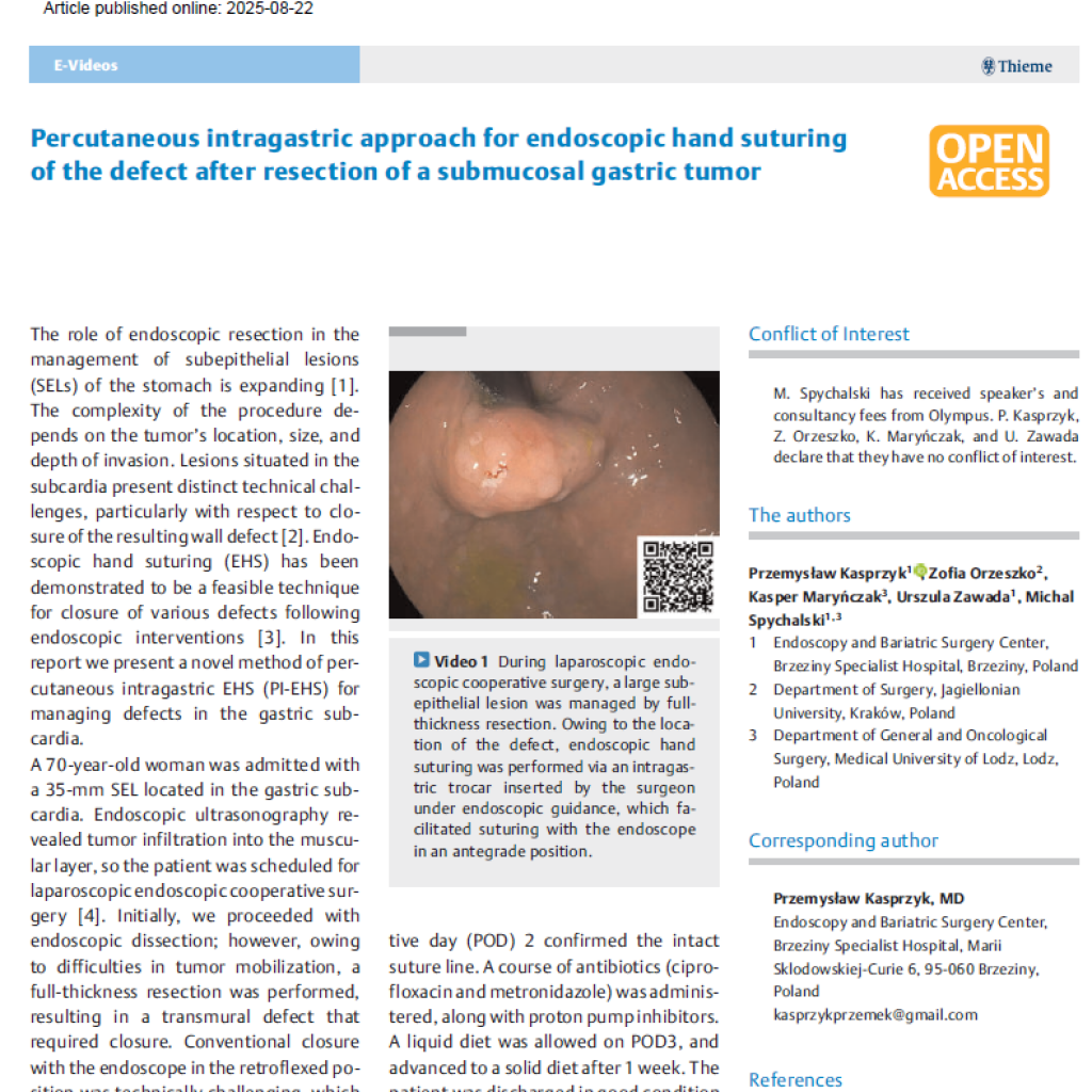 Opisaliśmy w nim nowy sposób resekcji guza żołądka połączonej z endoskopowym szyciem ubytku.